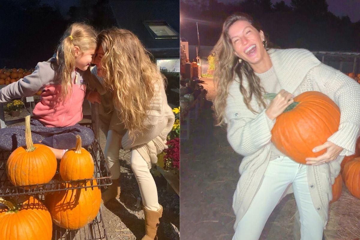 A esposa de Tom Brady mostrou que ela e a filha foram até uma plantação de abóbora para escolherem os melhores frutos para fazer as famosas lanternas com careta e também para preparar algumas guloseimas feita com a peça. “As crianças estão empolgadas para fazer suas lanternas de Halloween, mas eu só consigo pensar nos muffins e nas sementes de abóbora deliciosas!”, comentou Gisele sobre o dia ao lado de Vivian. Olha só: