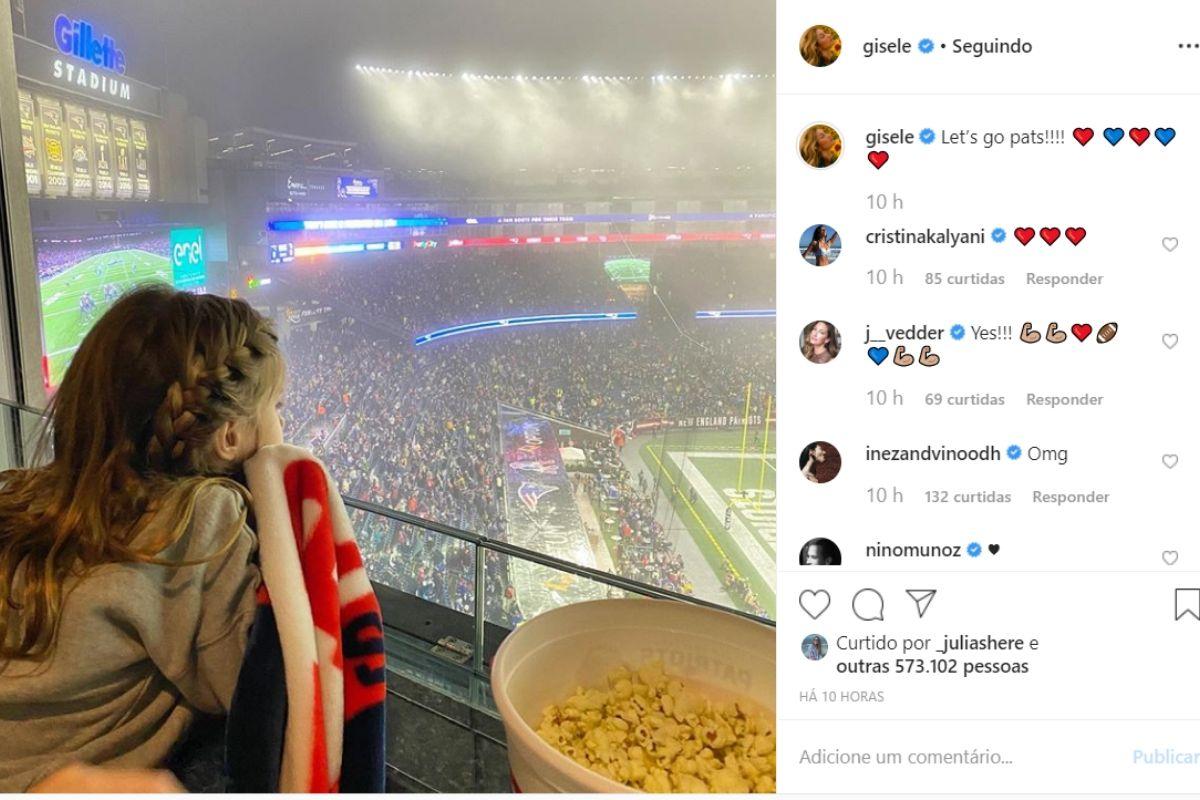 “Let’s go pats!!!!” ou “Vamos lá Patriots” era a legenda escolhida por Gisele e por mais que Tom tenha perdido o jogo e sido eliminado do campeonato nacional de Futebol Americano, os fãs da família eram só elogios para a imagem publicada pela modelo.