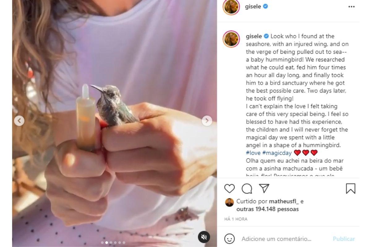 “Olha quem eu achei na beira do mar com a asinha machucada – um bebê beija-flor! Pesquisamos o que ele podia comer e o alimentamos a cada 15 minutos, durante o dia inteiro, até o levarmos para um santuário onde continuaram cuidando dele”, escreveu ela ao compartilhar o momento.