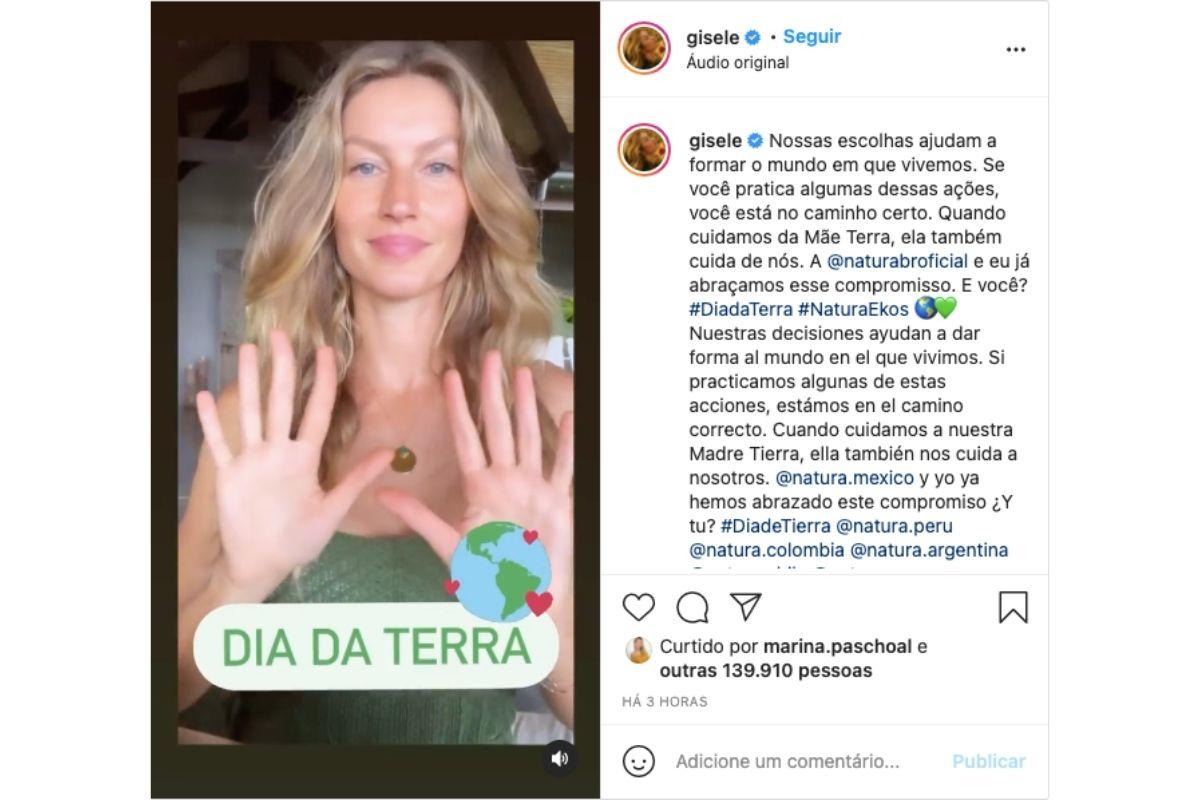 Gisele Bündchen postou vídeo nas redes sociais nesta quinta-feira, 22 de abril, o Dia da Terra, no qual provou que ela realmente se preocupa com o meio ambiente. A supermodelo é casada desde 2009 com Tom Brady, com quem tem Vivian Lake, de 8 anos, e Benjamin Rein, de 11.