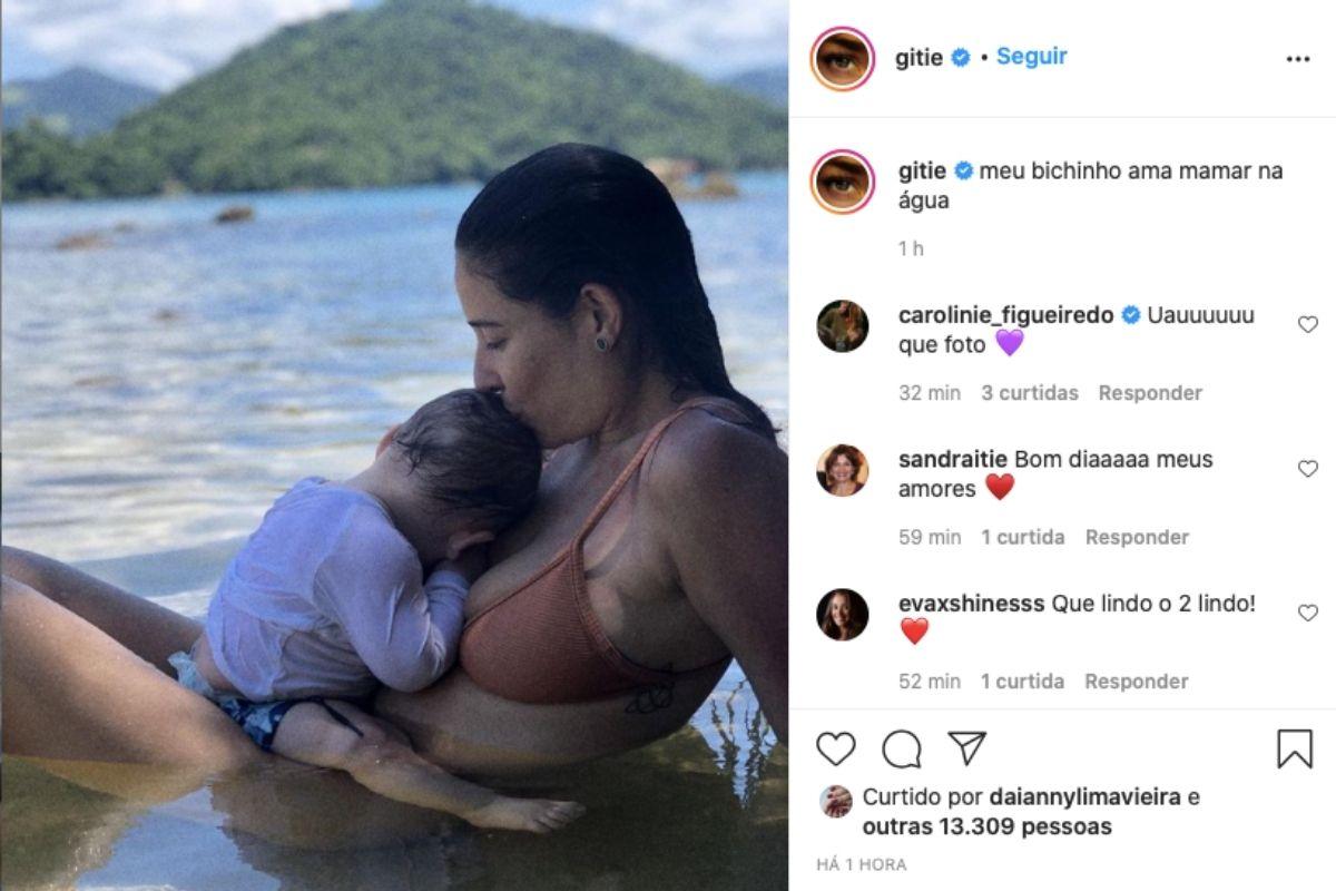 Nesta quarta-feira, 25 de novembro, Giselle Itié compartilhou foto com o filho Pedro Luna, de 9 meses dentro do mar. O menino é fruto de um antigo relacionamento da atriz com Guilherme Winter. Na imagem ela aparece amamentando o pequeno e conta que ele gosta de mamar na água.