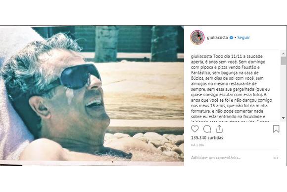No dia 11 de novembro, Giulia descreveu na legenda a saudade dos momentos especiais que tinha com o pai: “Sem domingo com pipoca e pizza vendo Faustão e Fantástico, sem bagunça na casa de Búzios, sem dias de sol com você, sem almoços no mesmo restaurante de sempre, sem essa sua gargalhada (que eu quase consigo escutar com essa foto)”.