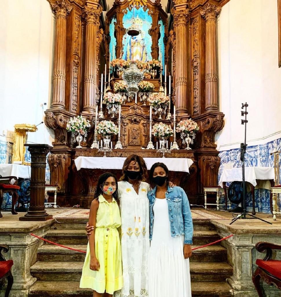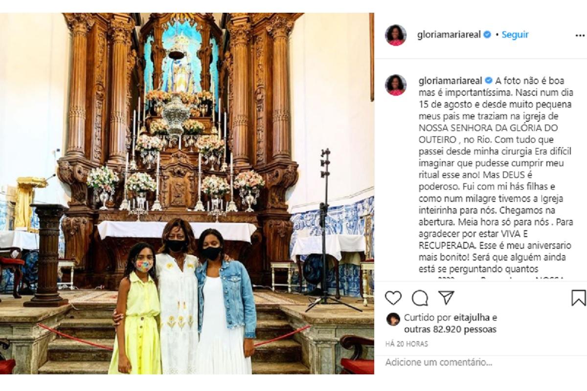 Glória Maria usou as redes sociais no último sábado, 15 de agosto, para falar sobre seu aniversário. E para isso publicou foto com as filhas, Laura e Maria, na igreja de Nossa Senhora da Glória do Outeiro, que fica no Rio de Janeiro. Na imagem, elas aparecem s três de máscara em frente ao altar.