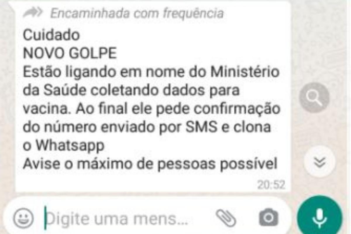 A pasta alertou ontem, 14 de janeiro, sobre essas iniciativas e relembrou a população de que eles não fazem agendamento de vacinação, não solicitam os dados pessoais e nem enviam quaisquer tipo de códigos para aqueles que usam o sistema de saúde. Caso você receba uma mensagem ou ligação pelo celular que promete agendar a vacina ou que solicite seus dados, a orientação dada pelo Ministério da Saúde, é que a pessoa não forneça nenhum dado e denuncie para as autoridades.