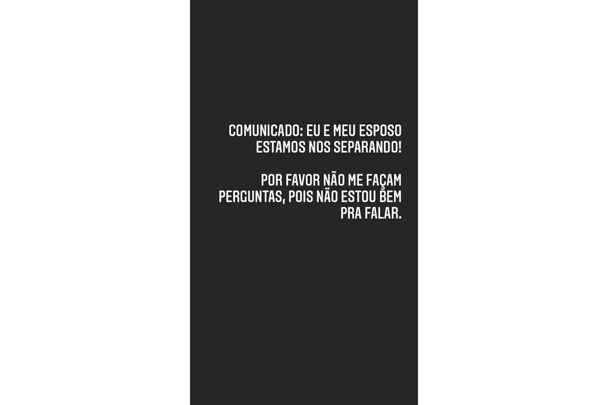 “Comunicado: eu e me esposo estamos nos separando! Por favor não me façam perguntas, pois não estou bem para falar”, escreveu ela, que espera a chegada do bebê Leon.