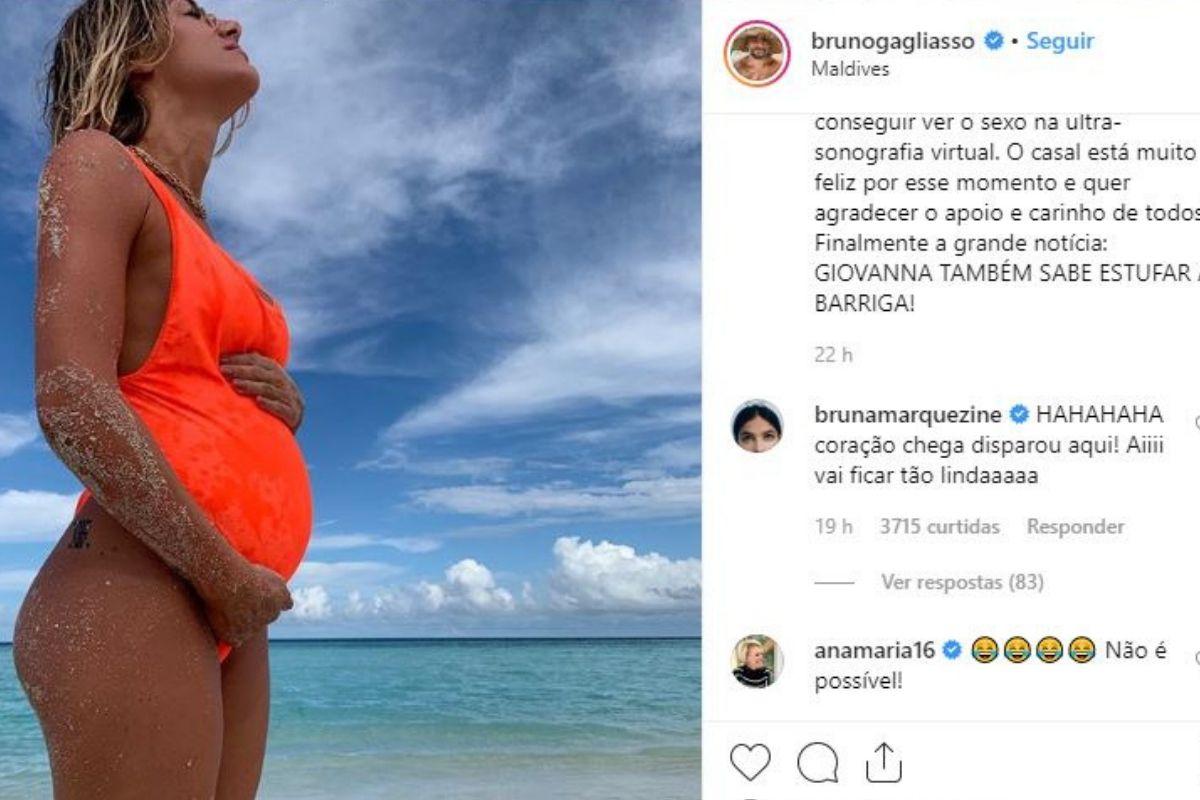 Bruno Gagliasso fez uma pegadinha com seus seguidores do Instagram neste final de semana e até a Marina Ruy Barbosa entrou na brincadeira nos comentários. A legenda foi: “Grávida de Vento, Giovanna Ewbank ostenta a barriguinha no Instagram do marido, que está sofrendo por não conseguir ver o sexo na ultrassonografia virtual. O casal está muito feliz por esse momento e quer agradecer o apoio e carinho de todos! Finalmente a grande notícia: Giovanna também sabe estufar a barriga!”.