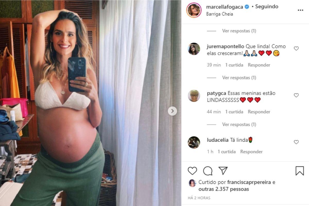 Marcella Fogaça usou as redes sociais nesta sexta-feira, 5 de fevereiro, para publicar uma linda foto em que mostra a barriga de grávida. A famosa está à espera de gêmeos, fruto do relacionamento com o ator Joaquim Lopes. Na imagem, ela aparece na frente do espelho, usando um sutiã e uma calça larga.