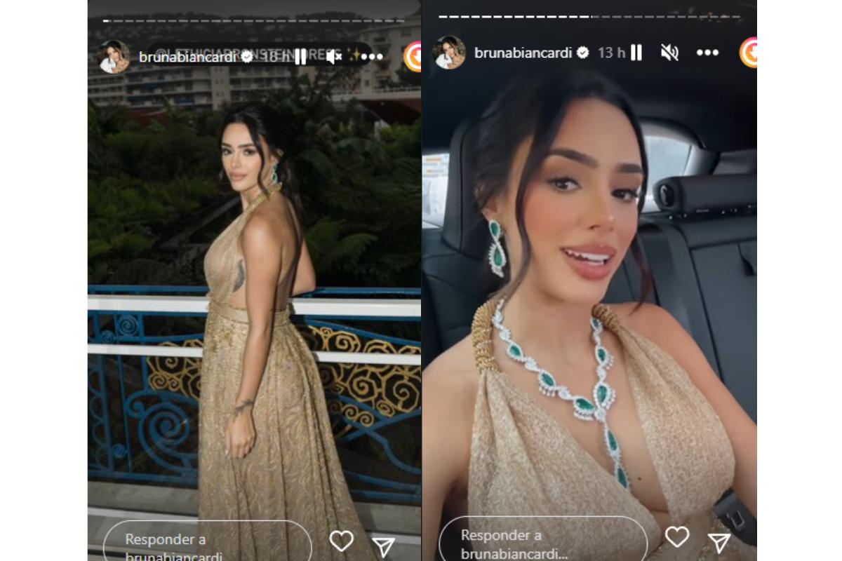 A 76ª edição do Festival acontece na França e Bruna apareceu com um vestido longo, cheio de brilhos e um conjunto de acessórios. Depois de gravar alguns detalhes de dentro e fora do evento, ela também aproveitou para mostrar o que a TV não mostra.