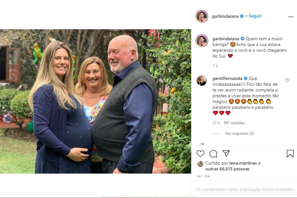 Na imagem com os pais, muitos famosos elogiaram a família. “Que lindezaaaaaaa!!!! Fico tão feliz de te ver assim radiante, completa e prestes a viver esse momento tão mágico! Parabéns, parabéns e parabéns”, disse a apresentadora Fernanda Gentil. E a atriz Thais Pacholek comentou: “Fico tão feliz de te ver assim. Radiante!! Sempre foi mas agora muito mais especial”. Confira a imagem abaixo: