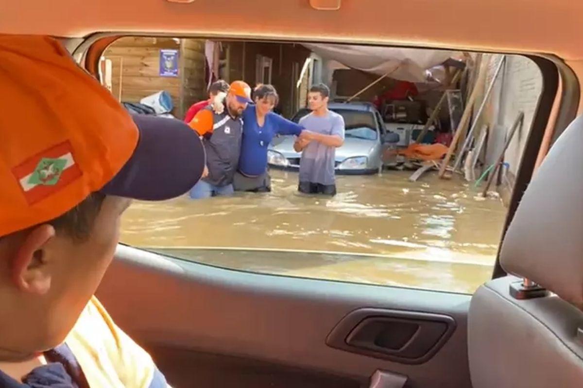 Uma grávida e uma idosa de 103 anos foram resgatadas pela Defesa Civil de Camboriú após rio transbordar e alagar várias ruas da região durante a noite desta terça-feira, 8 de junho, e a manhã desta quarta-feira, 9. Isso por conta da chuva forte registrada no local.