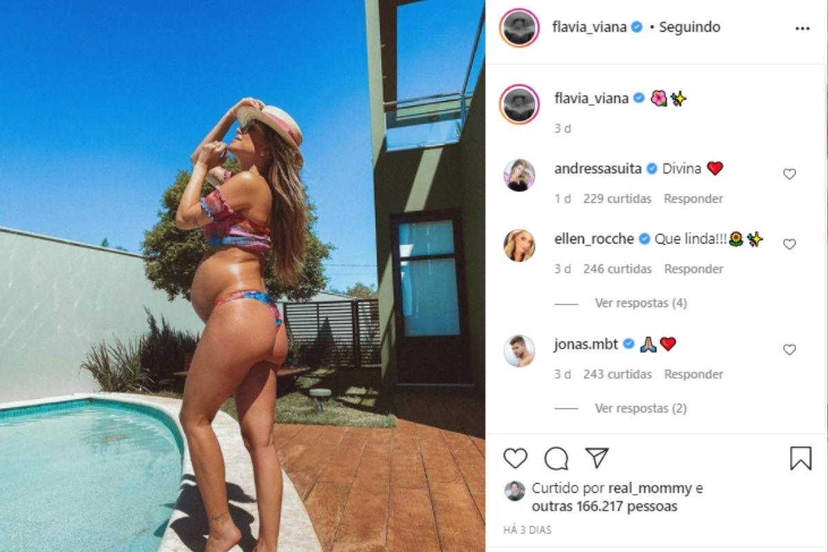 A influenciadora digital e ex-BBB Flávia Viana publicou vários stories no Instagram para rebater um comentário que recebeu em uma foto que aparece de biquíni. A famosa está a espera de um menino, que se chamará Gabriel, fruto do relacionamento com Marcelo Zangrandi.