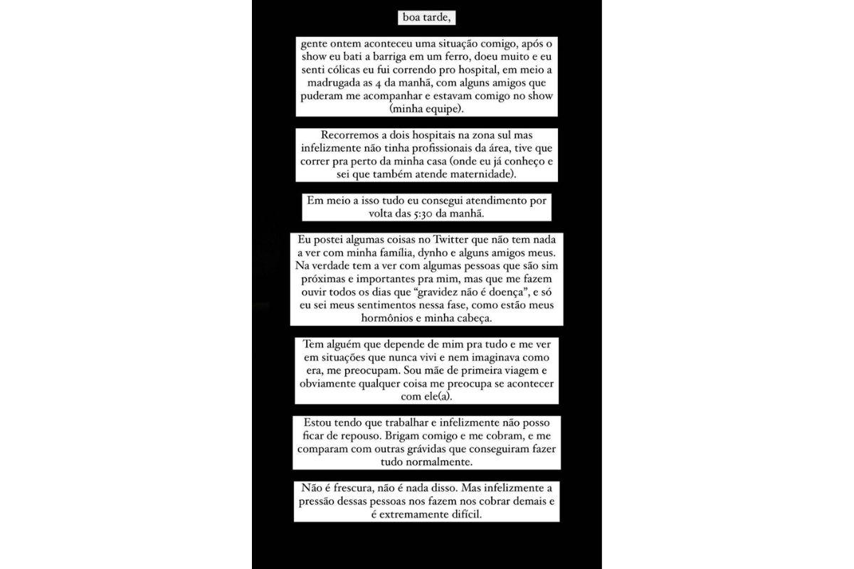 “Após o show, bati a barriga em um ferro. Doeu muito, senti cólicas e fui correndo para o hospital no meio da madrugada, às 4 horas da manhã, com alguns amigos que puderam me acompanhar e estavam comigo no show”, disse ela. A cantora ainda disse que foi para outro hospital pois o que estava, não tinham profissionais disponíveis.
