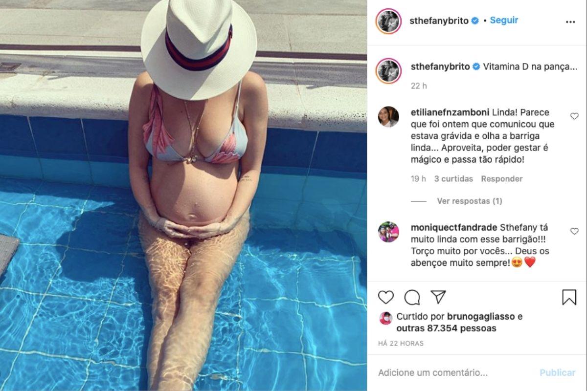 Sthefany Brito, de 33 anos, no último domingo, aproveitou a onda de calor para curtir uma piscina. Grávida do primeiro filho, a atriz mostrou a barriga de biquíni nas redes sociais: “Vitamina-D na pança”, brincou.