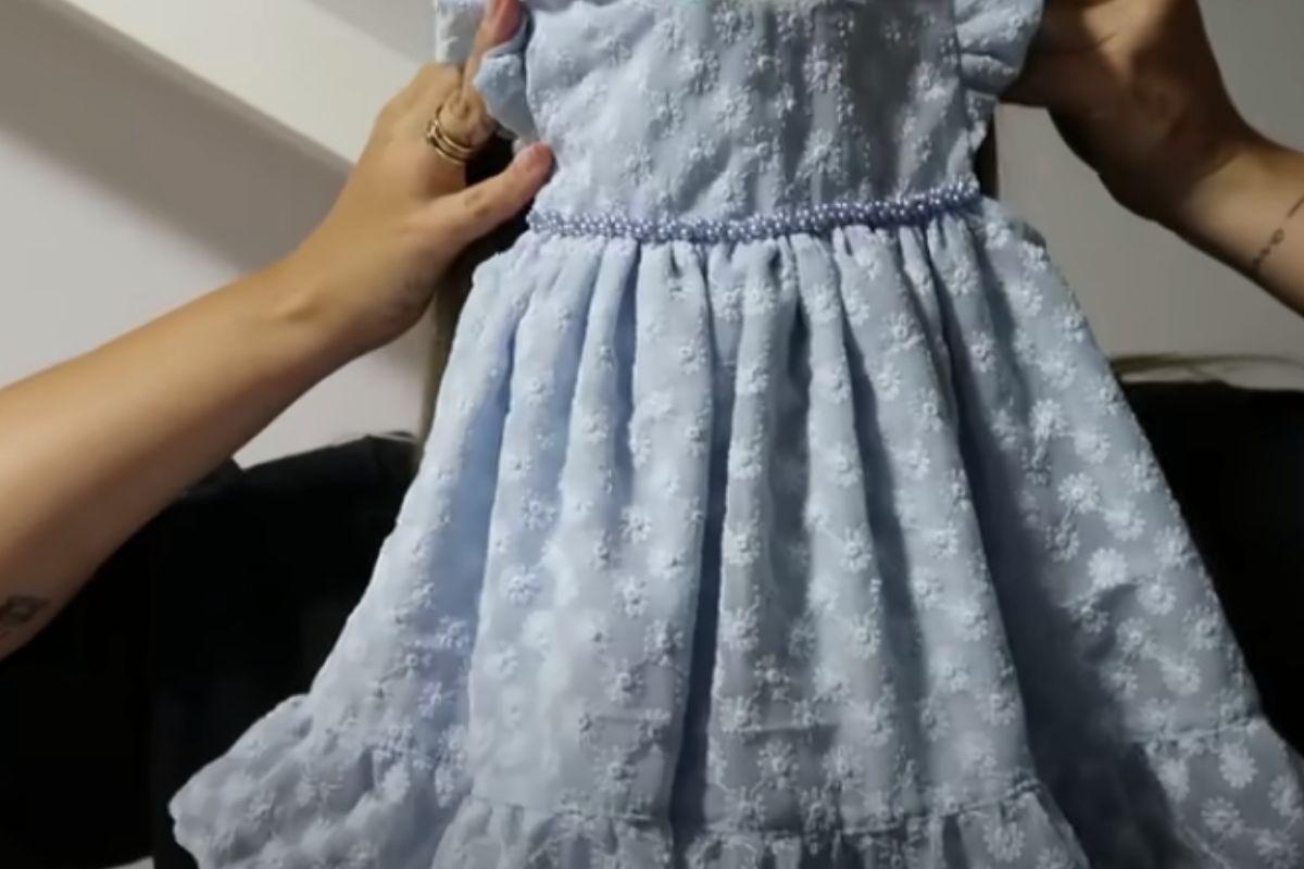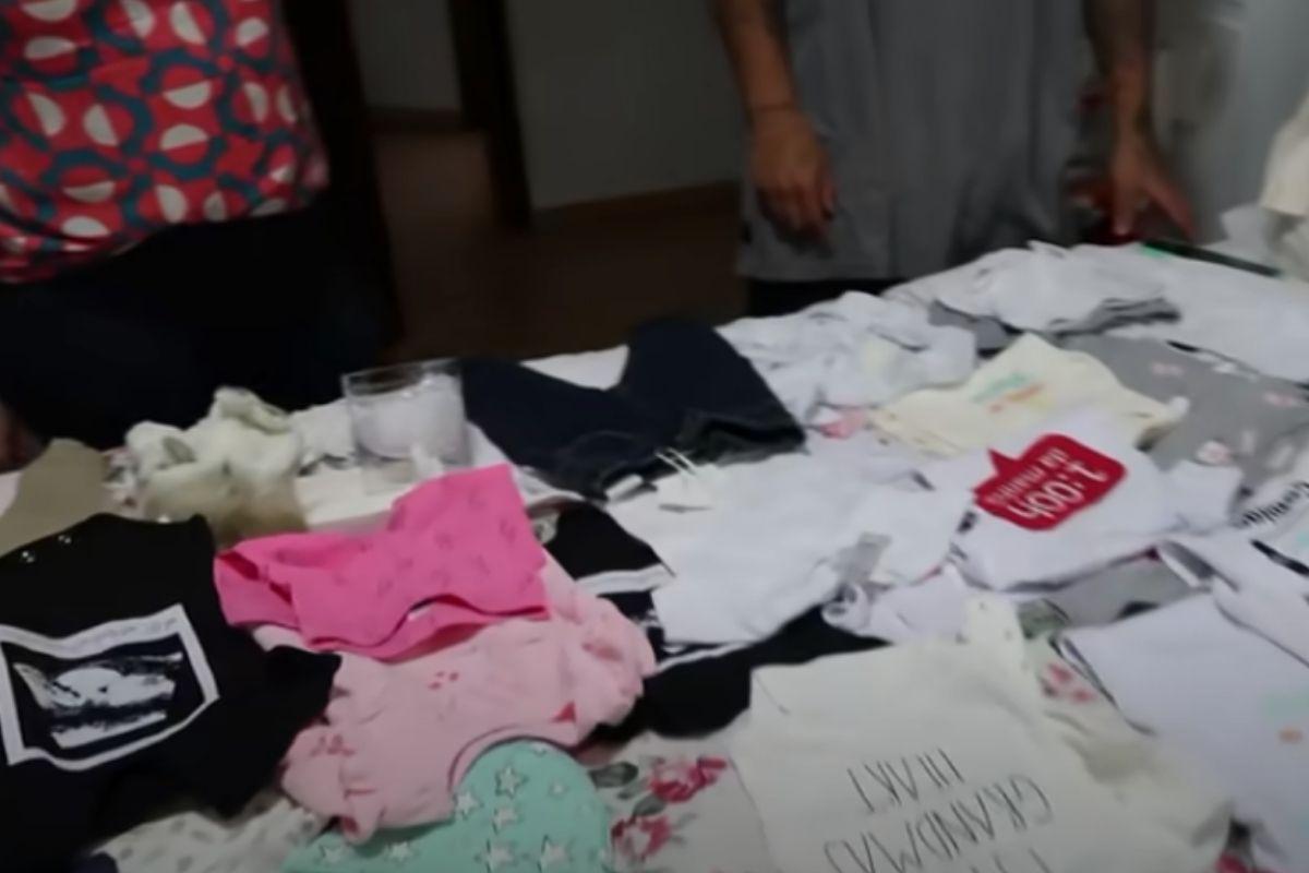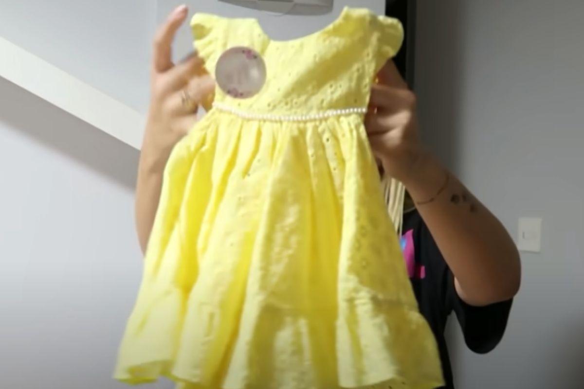 Com as peças em cima da cama, a grávida começou a mostrar os vestidos e macacões, dizendo que dessa vez eram roupas mais elaboradas, “de sair”. “Mas ela não vai sair né gente, porque é recém-nascida”, brincou.