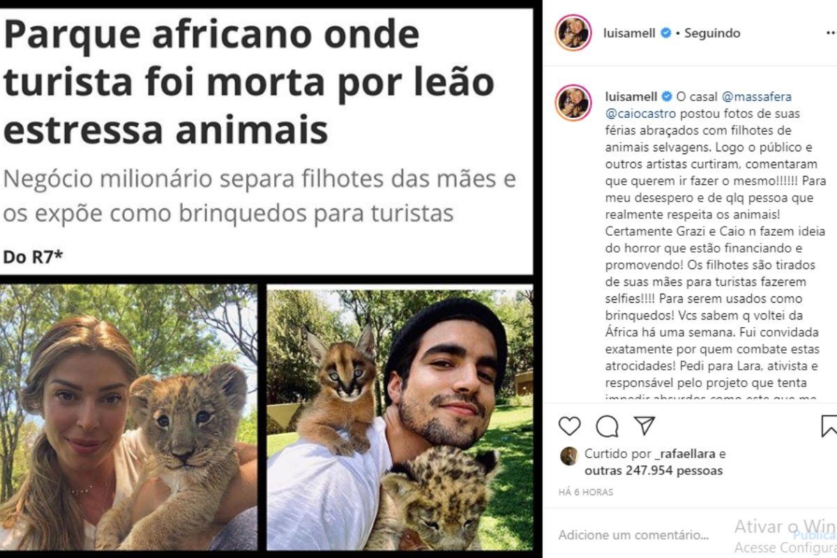 “O casal @massafera @caiocastro postou fotos de suas férias abraçados com filhotes de animais selvagens. Logo o público e outros artistas curtiram, comentaram que querem ir fazer o mesmo!!!!!! Para meu desespero e de qualquer pessoa que realmente respeita os animais! Certamente Grazi e Caio não fazem ideia do horror que estão financiando e promovendo! Os filhotes são tirados de suas mães para turistas fazerem selfies!!!! Para serem usados como brinquedos! Vocês sabem que voltei da África há uma semana. Fui convidada exatamente por quem combate estas atrocidades”, escreveu a ativista.