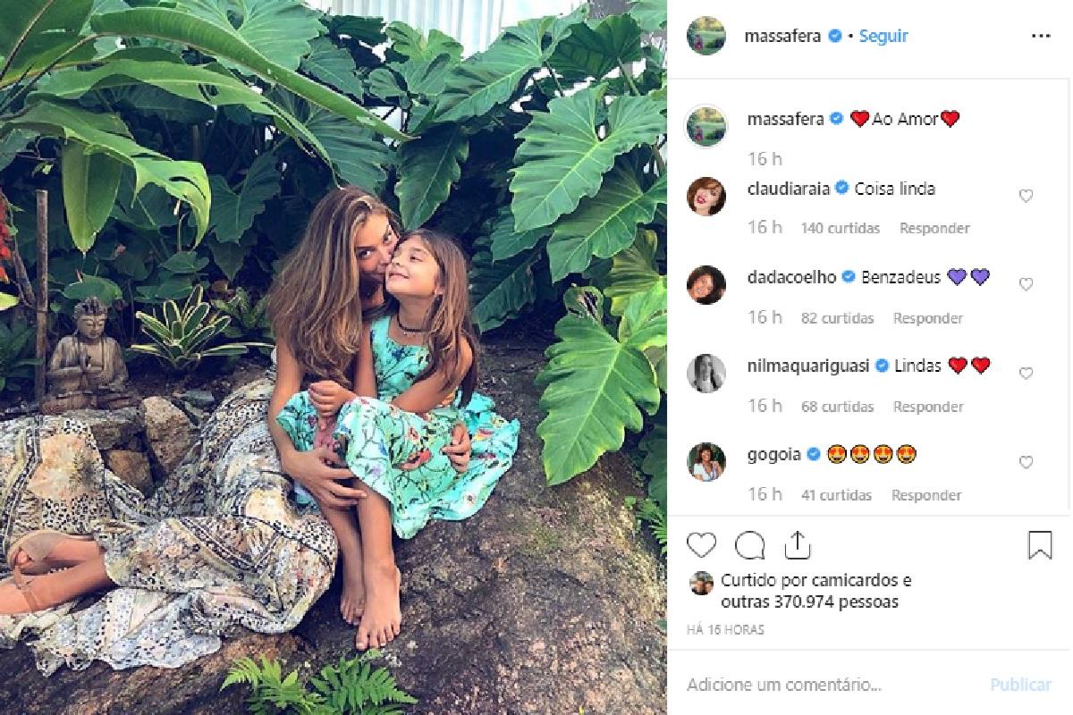 A atriz mostrou que nem sempre é preciso de um texto para expressar o que sentimos pela nossa família. “Ao amor”, foi tudo o que ela escreveu. As duas estão sentadas em uma pedra, Grazi abraça e beija a filha que fecha os olhos e dá um sorriso ao receber o carinho da mãe.