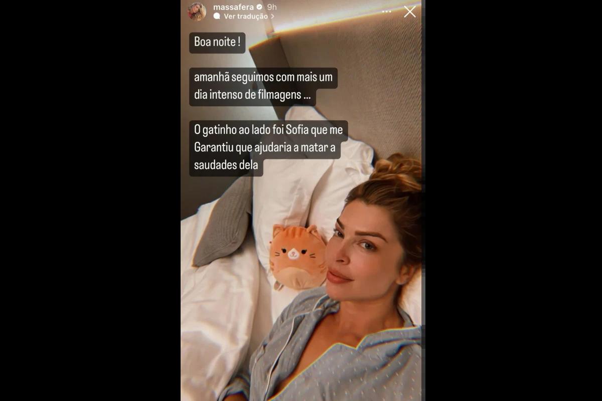 “Amanhã seguimos com mais um dia intenso de filmagens. O gatinho ao lado foi Sofia que me garantiu que ajudaria a matar a saudades dela”, explicou Grazi, aparecendo na cama ao lado do bichinho de pelúcia.