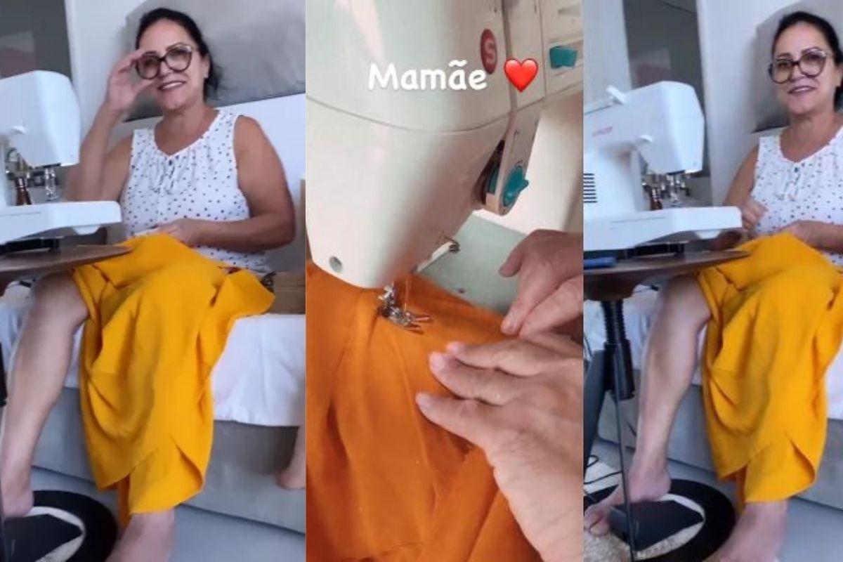 Atriz usou o Instagram para mostrar o momento ao lado da mãe. “Mamãe fazendo os consertos das minhas roupas como sempre. Aproveitando a mãe em casa para costurar as roupas, né, mãe?”, disse Grazi. Sentada no sofá, Cleusa respondeu com um sorrisão no rosto: “É, com o maior carinho”.
