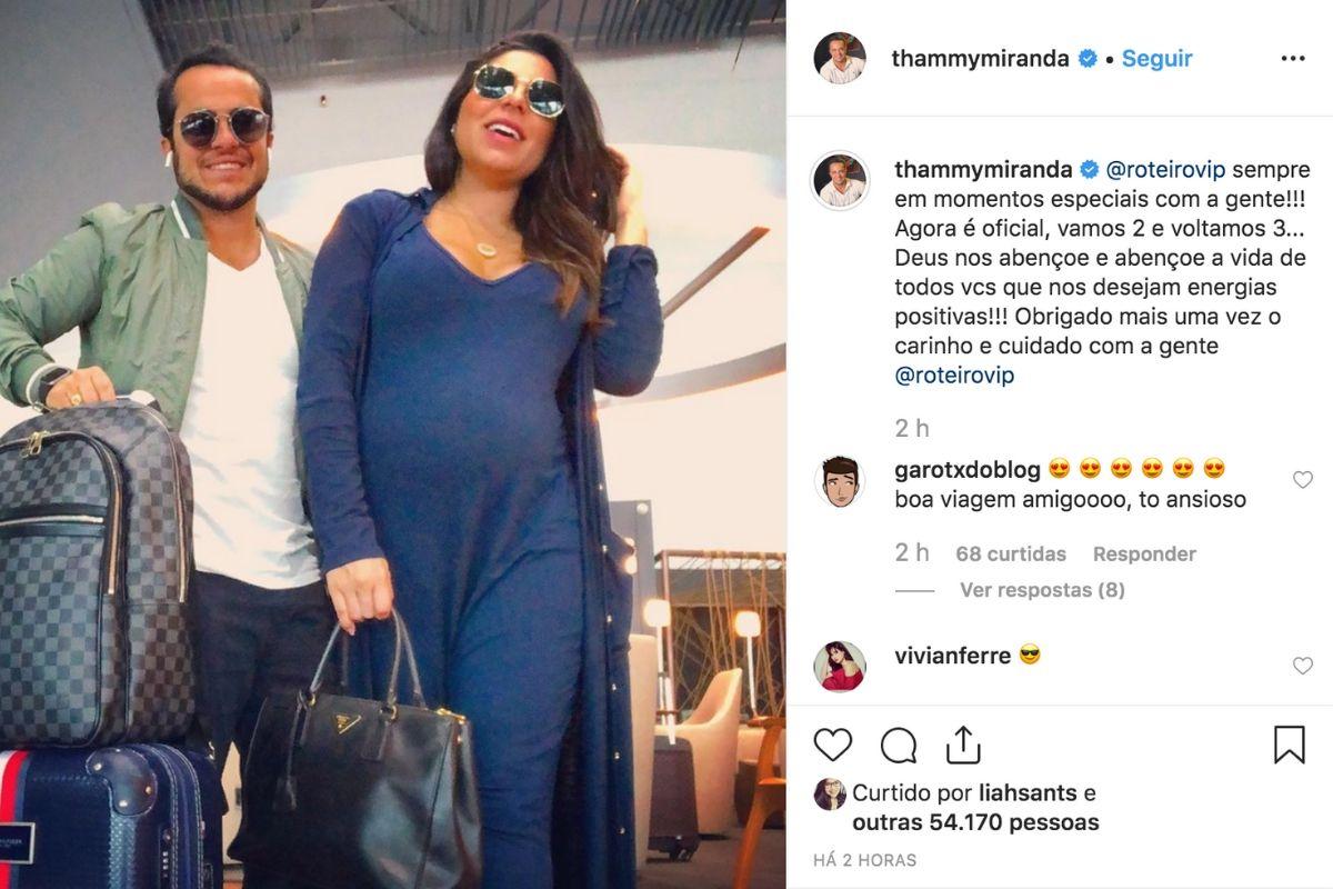 O casal viajou para os Estados Unidos para a chegada do menino. “Agora é oficial, vamos 2 e voltamos 3… Deus nos abençoe e abençoe a vida de todos vcs que nos desejam energias positivas!”, escreveu Thammy, na legenda de uma foto publicada no início de novembro.