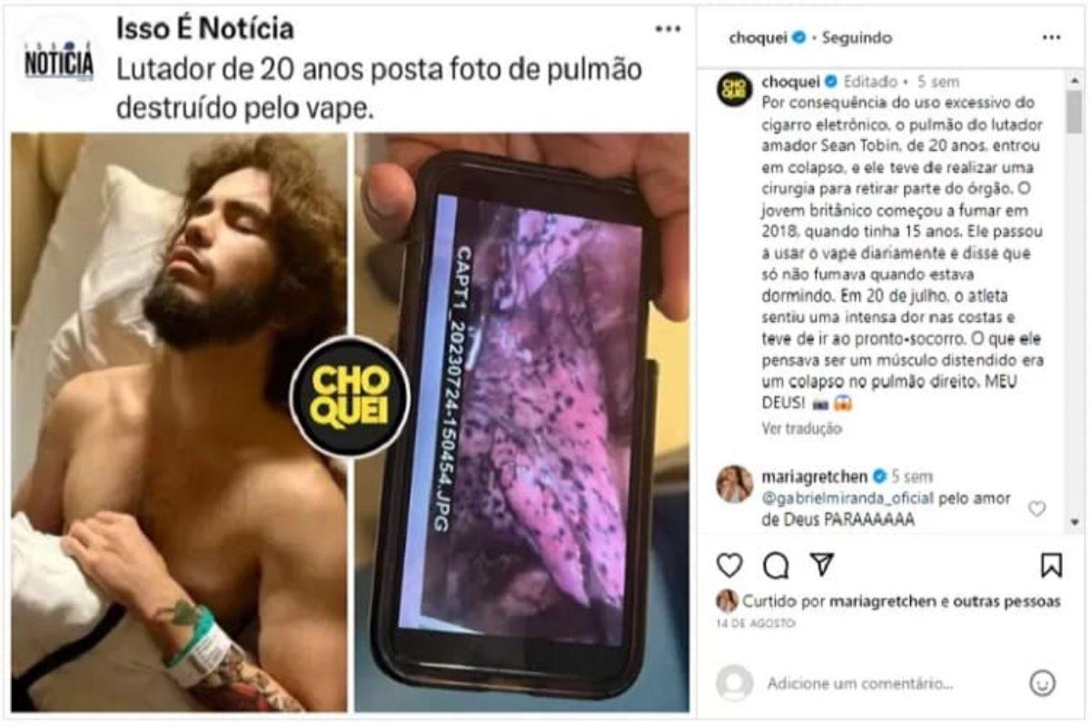 A publicação era sobre os efeitos do cigarro eletrônico no pulmão de uma pessoa. Ao ver isso, a artista ficou assustada e deixou um recado para o filho: “Pelo amor de Deus, pare”. Os fãs concordaram com a cantora e deixaram mensagens em apoio ao pedido dela. “Briga mesmo, rainha!! Isso é pior que cigarro comum. É química sintética das brabas. Mata rápido”, disse um. “Isso mesmo, eu já vi vários casos graves de usuários desse cigarro”, comentou outro.