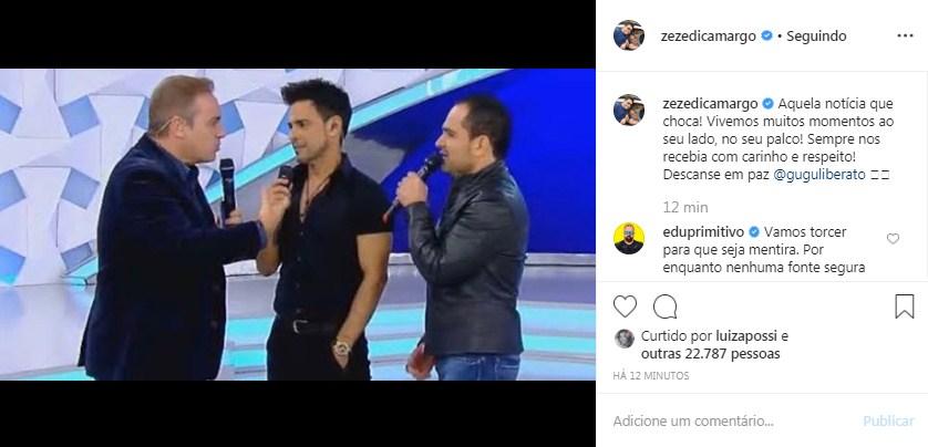 Zezé Di Camargo também prestou seus sentimentos à família de Gugu nas redes sociais. O cantor disse que a notícia foi chocante para ele e a família. “Vivemos muitos momentos ao seu lado, no seu palco! Sempre nos recebia com carinho e respeito. Descanse em paz!”, escreveu na legenda.