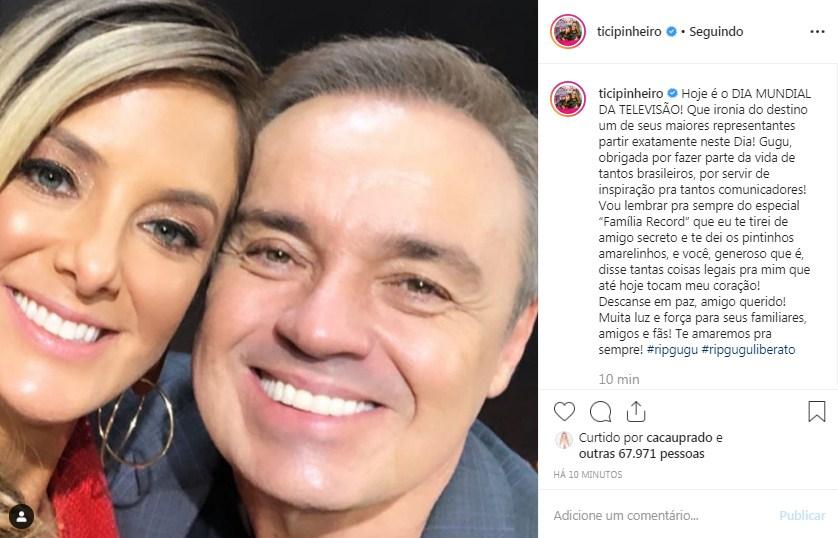 Ticiane Pinheiro foi a primeira a publicar uma homenagem ao apresentador no Instagram. “Hoje é o DIA MUNDIAL DA TELEVISÃO! Que ironia do destino um de seus maiores representantes partir exatamente neste Dia! Gugu, obrigada por fazer parte da vida de tantos brasileiros, por servir de inspiração pra tantos comunicadores! Vou lembrar pra sempre do especial “Família Record” que eu te tirei de amigo secreto e te dei os pintinhos amarelinhos, e você, generoso que é, disse tantas coisas legais pra mim que até hoje tocam meu coração! Descanse em paz, amigo querido! Muita luz e força para seus familiares, amigos e fãs! Te amaremos pra sempre!”, escreveu a apresentadora na legenda do Instagram.