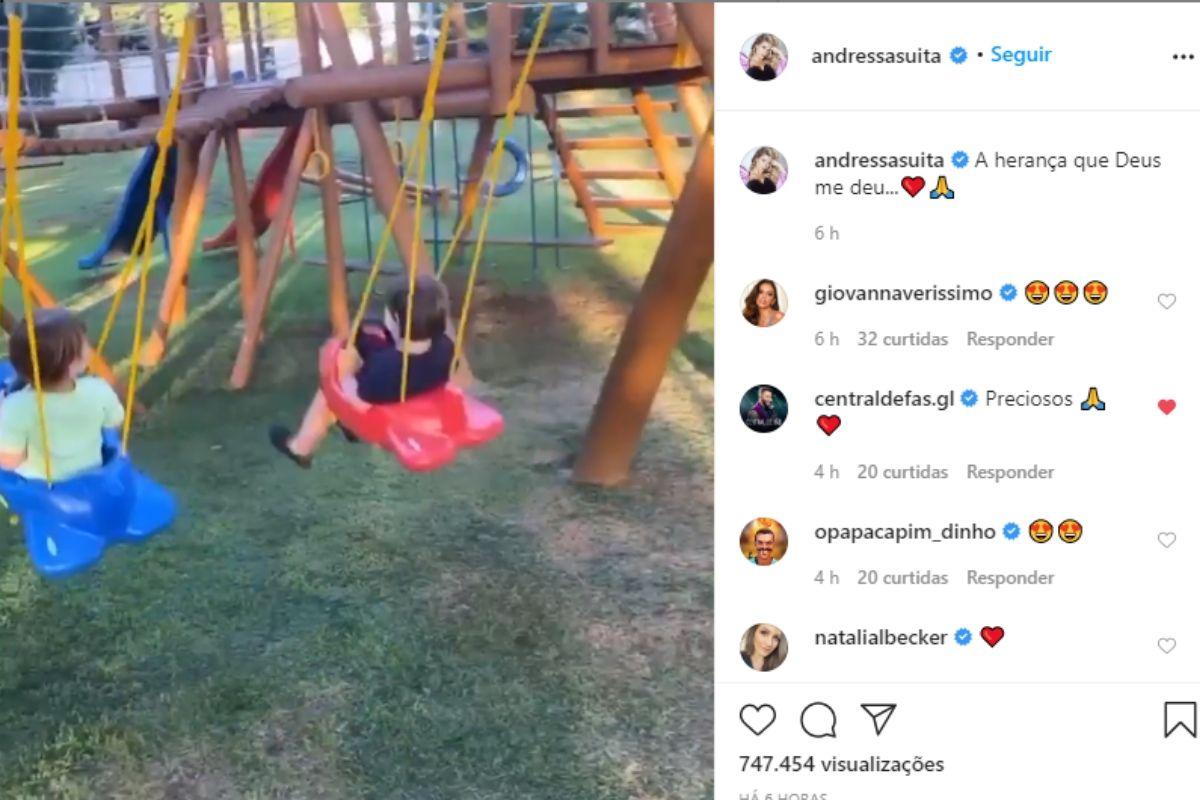 A modelo Andressa Suíta usou as redes sociais para compartilhar um momento em família. A famosa publicou imagens dos filhos brincando no parquinho particular. Nas imagens, as crianças aparecem se divertindo, cada um em um balanço. É possível ver que, além dos balanços, o parquinho também conta com uma ponte de madeira, dois escorregas e duas gangorras.