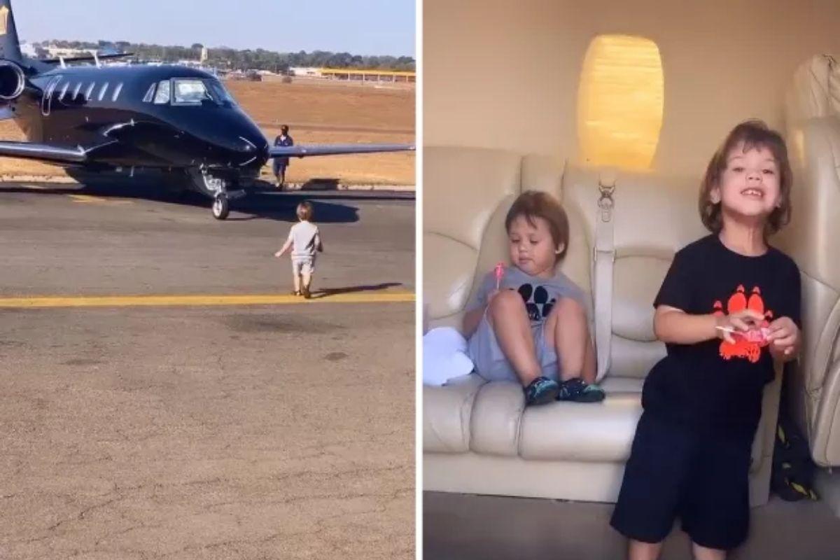 Nas imagens, é possível ver o pai levando os filhos para o local onde a aeronave estava e depois as crianças correndo em direção aos assentos. Gusttavo olha para Gabriel e Samuel e diz: “Bora?”, e é respondido com o sorriso de animação das crianças. O jatinho preto é avaliado em 180 milhões de reais.