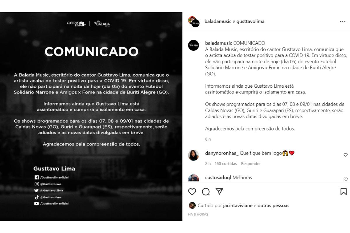 Já no feed, a assessoria de imprensa do cantor emitiu nota oficial sobre o estado de saúde de Gusttavo Lima: “COMUNICADO A Balada Music, escritório do cantor Gusttavo Lima, comunica que o artista acaba de testar positivo para a COVID 19. Em virtude disso, ele não participará na noite de hoje (dia 05) do evento Futebol Solidário Marrone e Amigos x Fome na cidade de Buriti Alegre (GO). Informamos ainda que Gusttavo Lima está assintomático e cumprirá o isolamento em casa.”