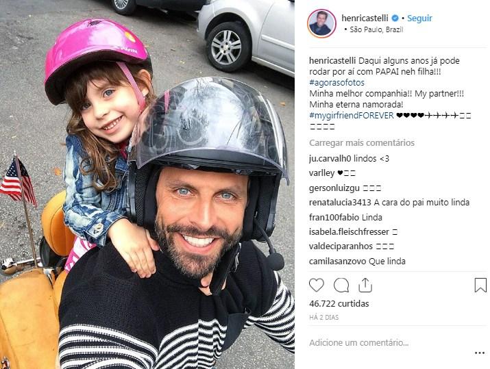 A ator Henri Castelli publicou no último domingo (16) em seu perfil do Instagram, uma foto com a filha Maria Eduarda, de 4 anos, montada na garupa de sua moto. “Daqui alguns anos já pode rodar por aí com o papai, né filha?”, escreveu. Henri também é pai de Lucas, de 11 anos.
