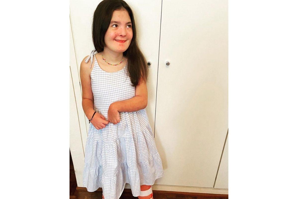 “Bom dia! Meu amorzão cada dia mais linda e feliz fazendo o uso do cannabidiol”, escreveu Fogaça na legenda da publicação. Nas imagens, Olívia aparece usando um vestido quadriculado branco e azul claro de alças. Ela está de pé e sorri para o lado.