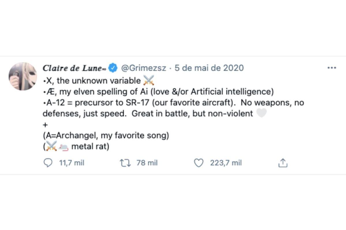 X é a variável desconhecida (usou emoji de duas espadas cruzadas, formando um X). Æ é a ortografia élfica de Ai (amor e/ou inteligência artificial). A-12 = precursora da SR-17 (nossa aeronave favorita). Sem armas, sem defesas, apenas velocidade. Ótimo em batalha, mas não violento. A = Archangel, minha música favorita”, escreveu Grimes no Twitter.