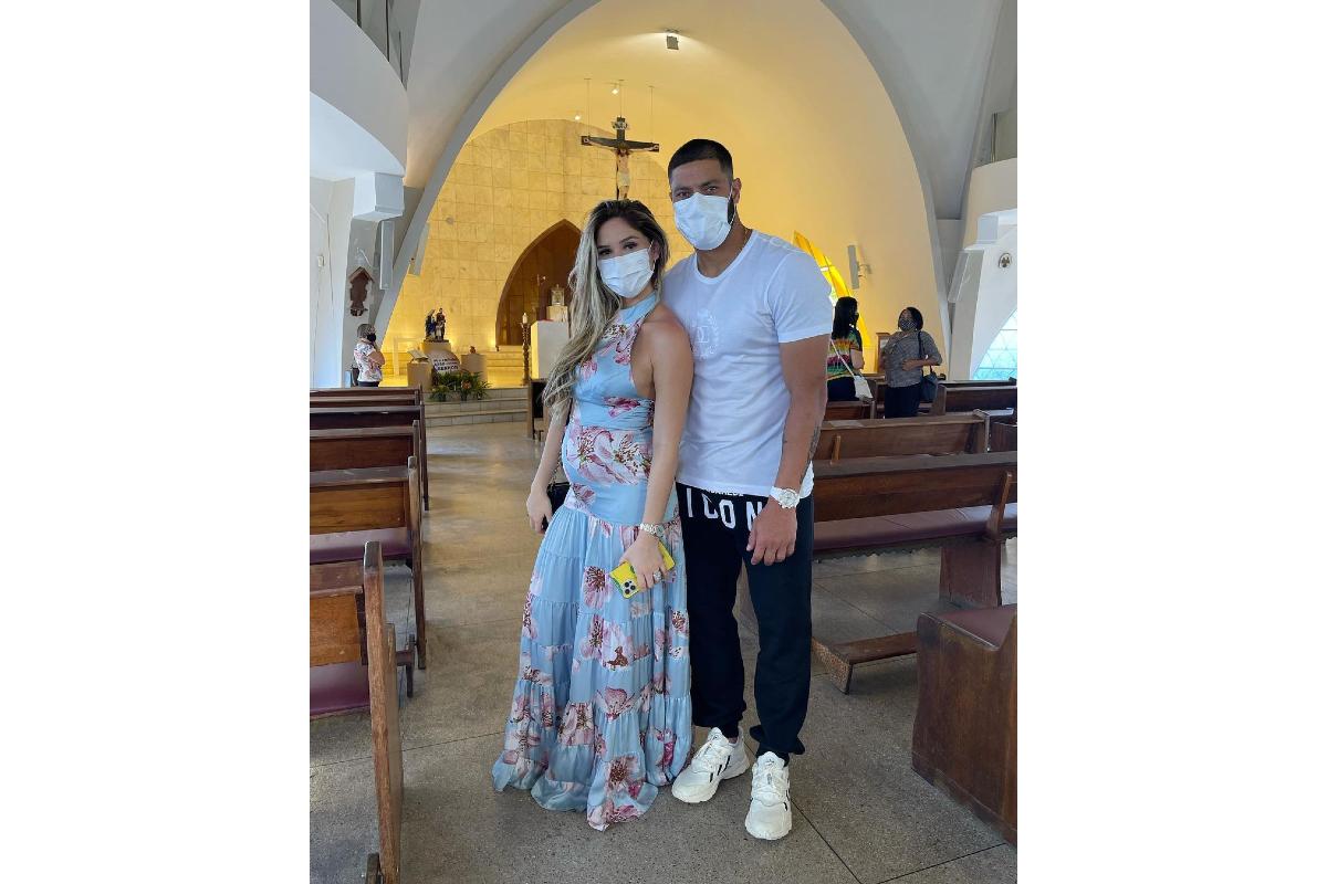 Grávida, ela foi com o jogador à missa e apareceu mostrando barriga que já está bem aparente.