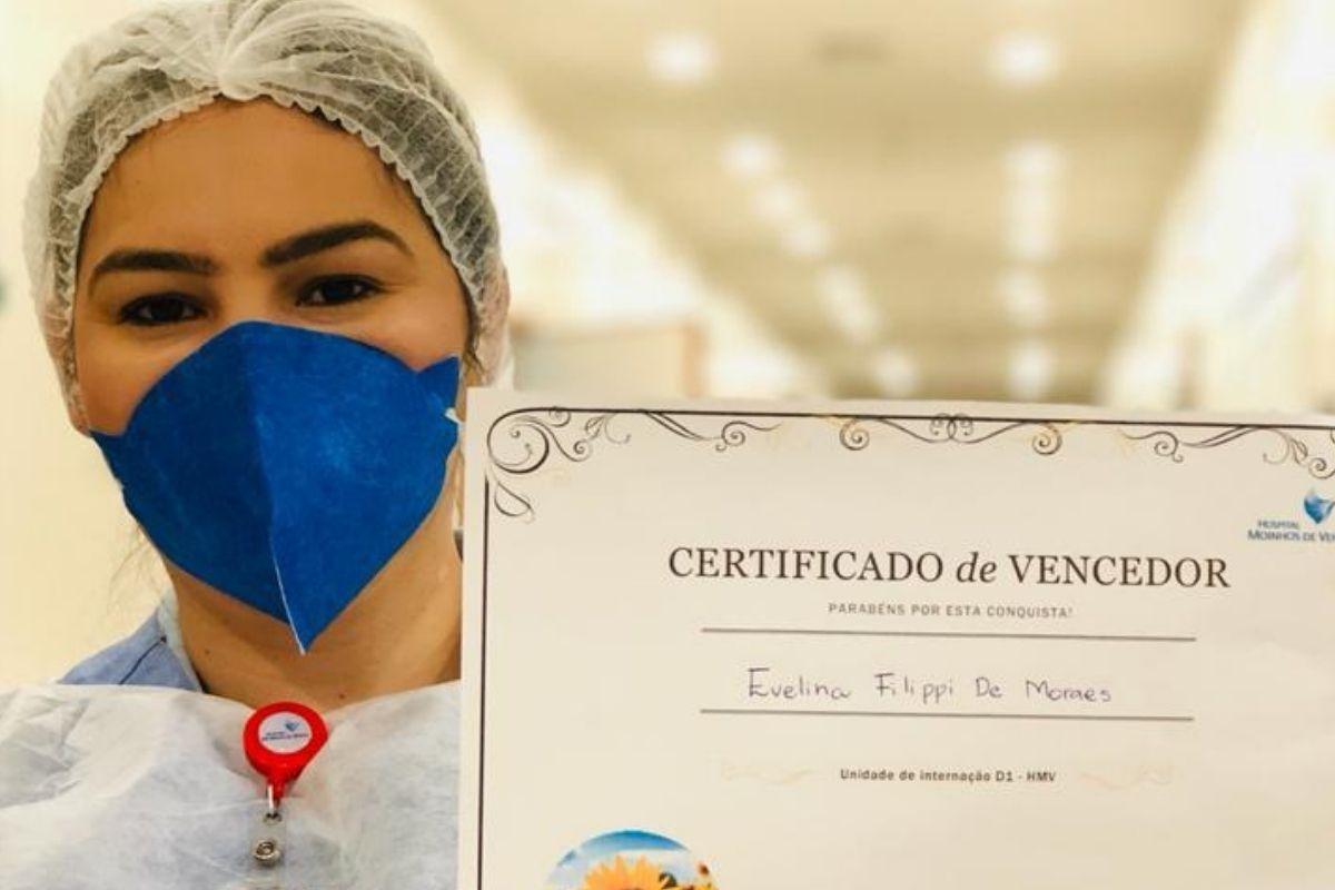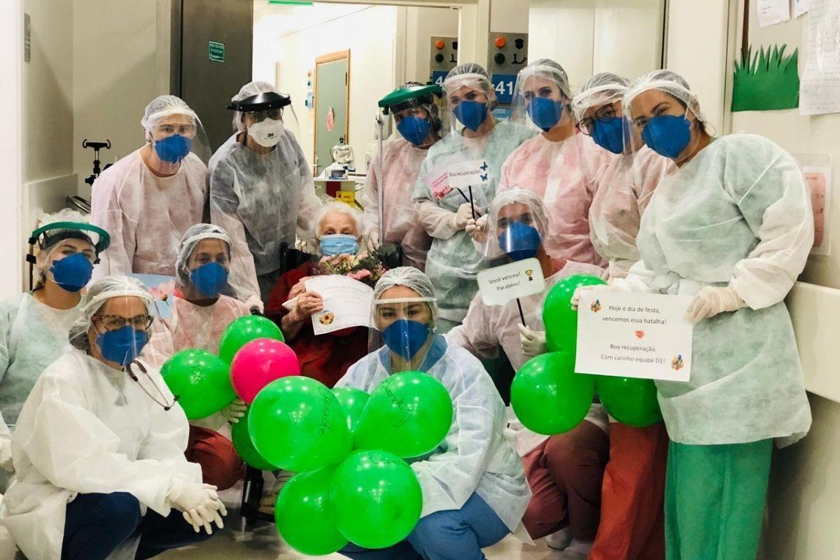 A idosa foi a paciente mais velha a se recuperar do coronavírus no hospital. A cura alegrou toda a equipe médica da instituição, que fez uma verdadeira festa para comemorar a despedida de Evelina. Teve flores, balões e até ‘Certificado de Vencedora’.