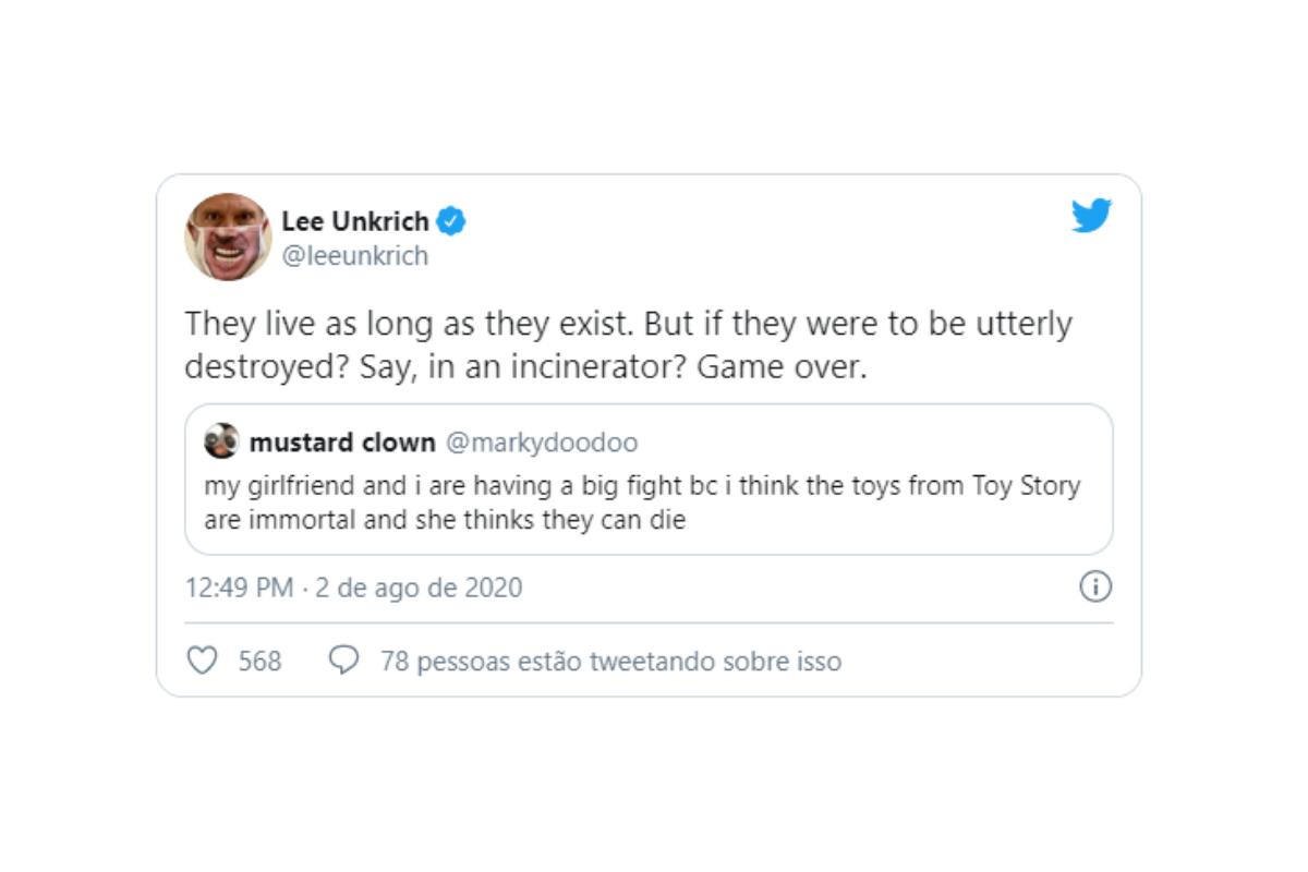 O diretor de Toy Story 3, Lee Unkrich, tirou uma dúvida importante sobre o universo dos brinquedos da saga. No Twitter, ele encontrou um internauta fazendo a seguinte questão: “Minha namorada e eu estamos brigando feio porque eu acho que os brinquedos de Toy Story são imortais e ela acha que eles podem morrer”.