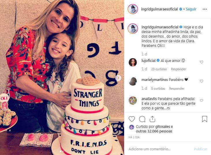 “Hoje é o dia dessa minha afilhadinha linda, da paz, dos desenhos, do amor, dos olhos lindos. E o amor da vida da Clara. Parabéns, Oli!”, disse Ingrid na legenda da publicação. Ingrid também publicou uma foto da filha Clara ao lado de Olivia. O tema da festa de Olivia foi a série Stranger Things e o bolo foi o que mais chamou a atenção dos convidados.