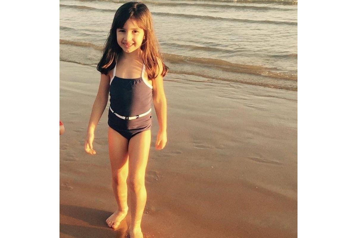 Na segunda foto toda alegria que a menina transparece é reforçada, durante um passeio à praia.