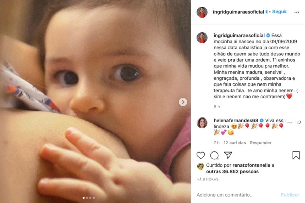 Ingrid Guimarães usou as redes sociais para comemorar mais um ano de vida da filha Clara, fruto do relacionamento com Renê Machado. No Instagram, a atriz comemorou, nesta quarta-feira, 9 de setembro, 11 anos de vida da menina com sequência de fotos e declaração de amor. “Te amo minha neném”, disse.