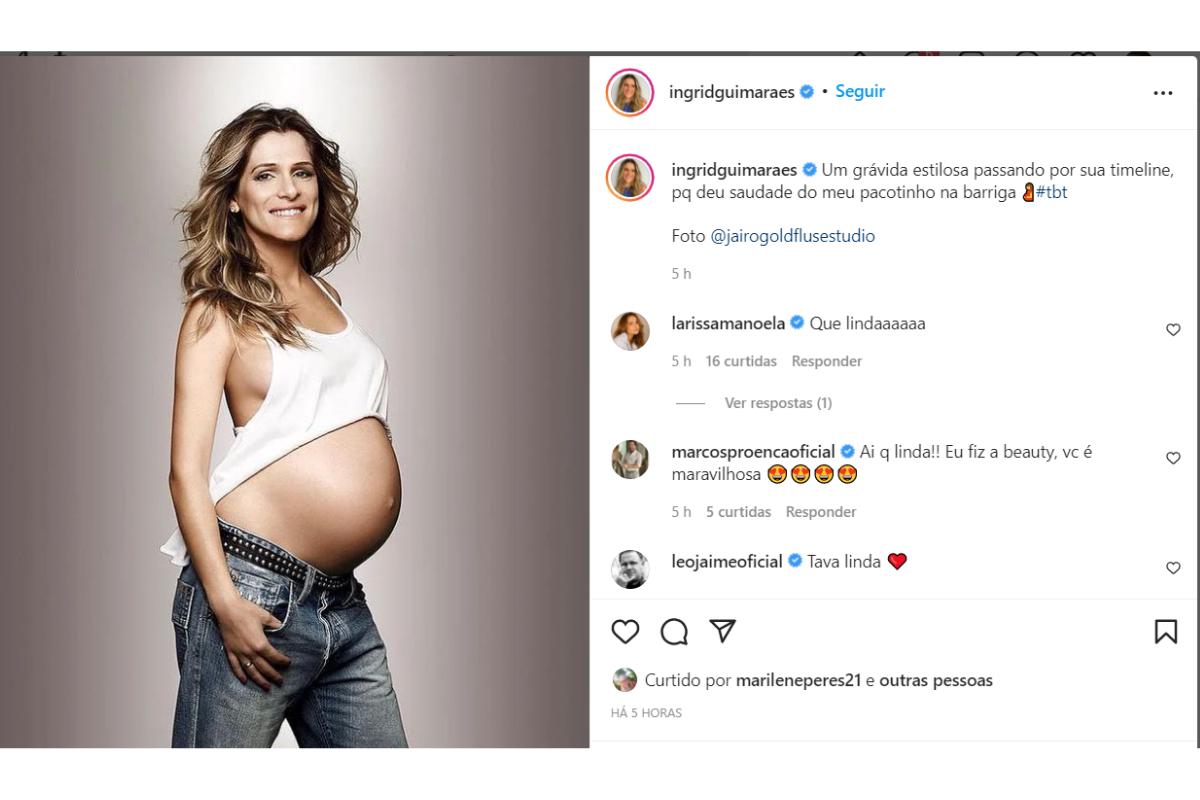 Já nos comentários, fãs e colegas de profissão que acompanham Ingrid Guimarães não seguraram elogios à ela. “Que lindaaaaaa”, disse Larissa Manuela. “Ai q linda!! Eu fiz a beauty, vc é maravilhosa”, afirmou o cabelereiro Marcos Proença. “Barriga linda!”,