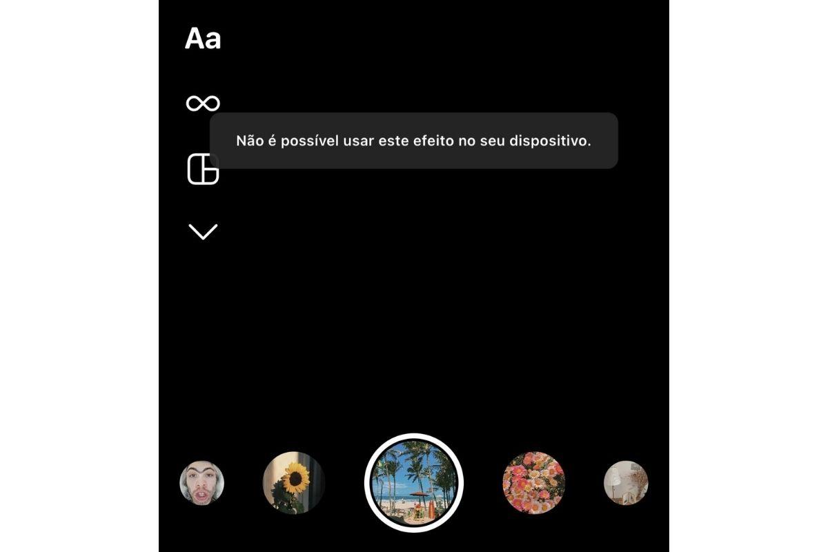 As principais reclamações estão justamente relacionadas aos famosos filtros presentes na redes social. Quando vão publicar algum story, o usuário entra na área para selecionar o filtro, mas logo é barrado, com uma mensagem dizendo que não é possível acessar o efeito no dispositivo.