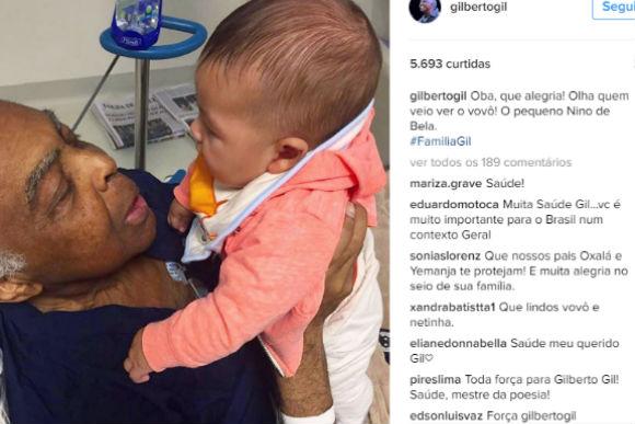 Gilberto Gil recebeu a visita muito especial do neto Nino, filho de Bela Gil, no Hospital Sírio-Libanês, em São Paulo, nesta sexta (2). O músico compartilhou a foto em que aparece segurando o neto no colo no seu Instagram.