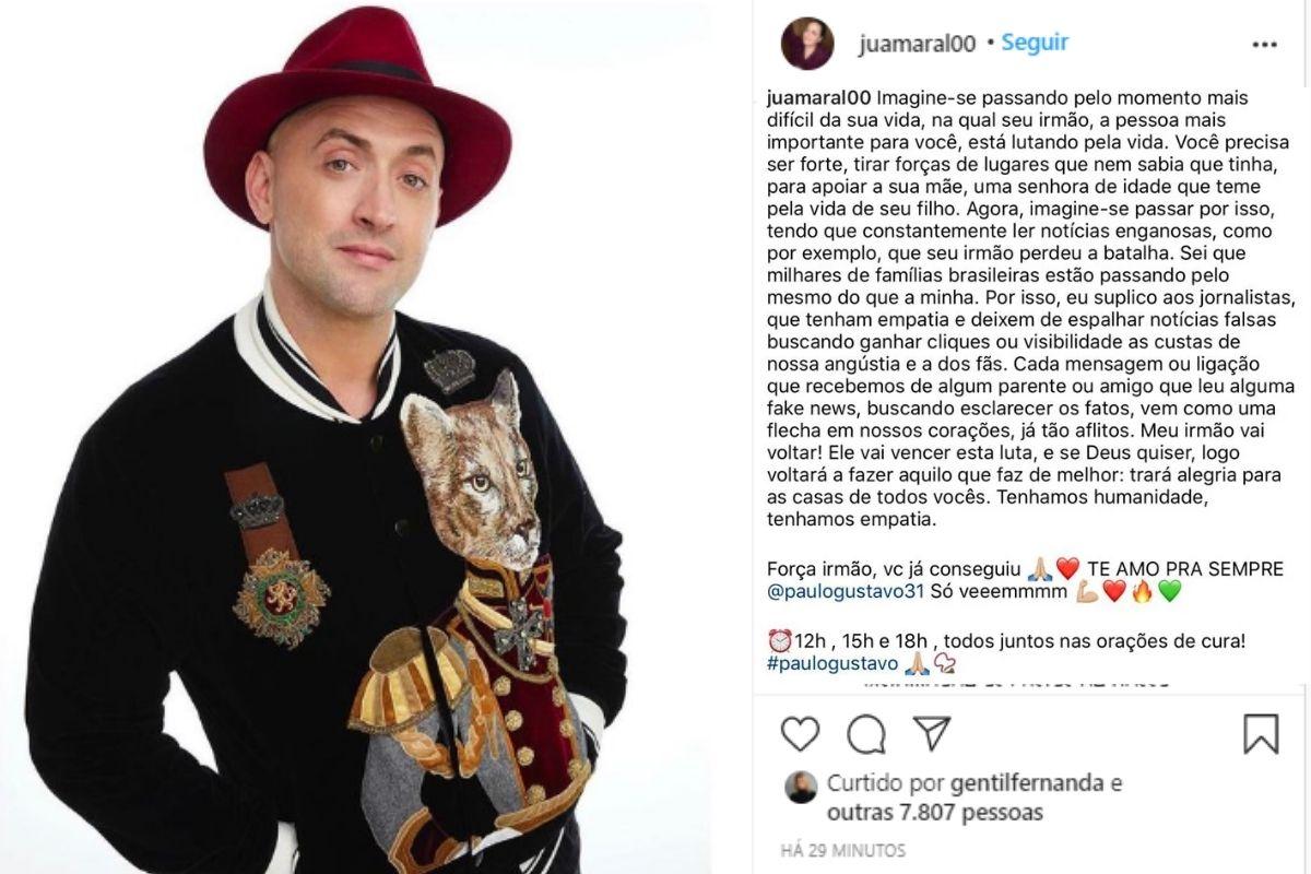 Irmã de Paulo Gustavo, Ju Amaral usou o Instagram na noite deste domingo, 11 de abril, para fazer um desabafo sobre as Fake News sobre a morte do ator, que segue internado desde o último dia 13 devido às complicações da Covid-19.