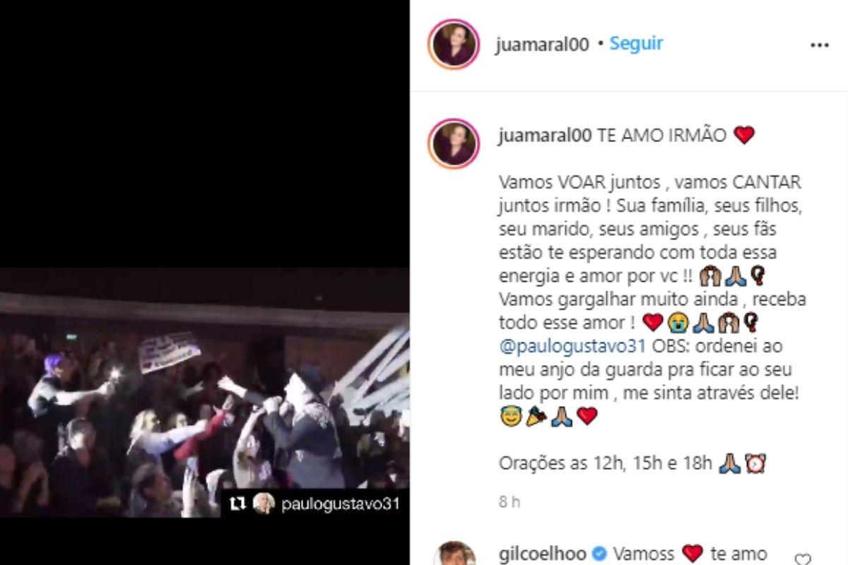 “Receba todo esse amor, @paulogustavo31. OBS: ordenei ao meu anjo da guarda pra ficar ao seu lado por mim, me sinta através dele! Orações às 12h, 15h e 18h”, escreveu ela na legenda da publicação, pedindo orações pelo estado de saúde de Paulo Gustavo.