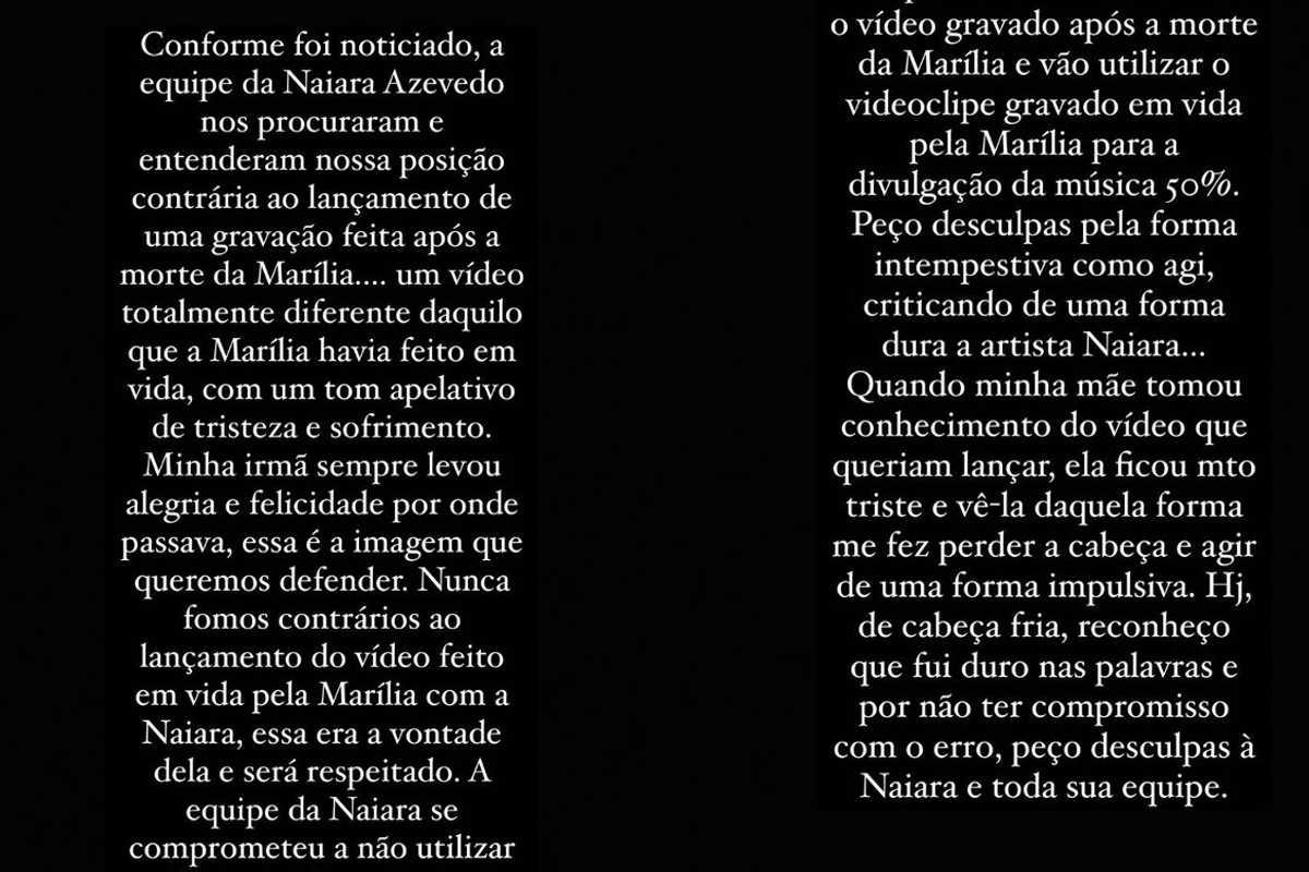 No texto, ele ainda falou sobre o acordo: “A equipe da Naiara se comprometeu a não utilizar o vídeo gravado após a morte da Marília e vão utilizar o videoclipe gravado em vida pela Marília para a divulgação da música 50%”.