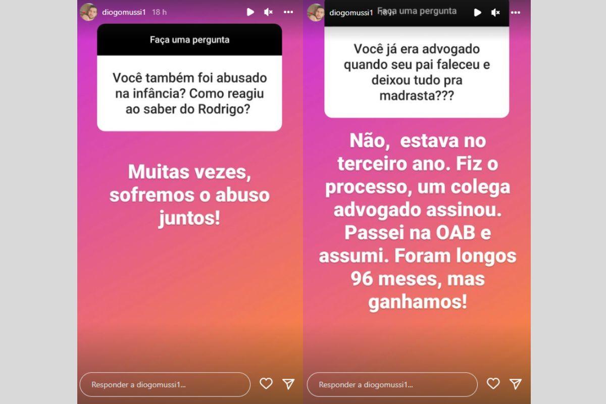 “Muitas vezes. Sofremos o abuso juntos”, escreveu ele, que atualmente é advogado. O irmão de Rodrigo comentou ainda sobre outras polêmicas envolvendo sua família. Ele contou que, após a perda do pai, episódio também narrado pelo ex-BBB na TV, houve um conflito na família envolvendo o inventário. Diogo disse ter movido um processo contra a ex-madrasta para reivindicar a herança paterna.