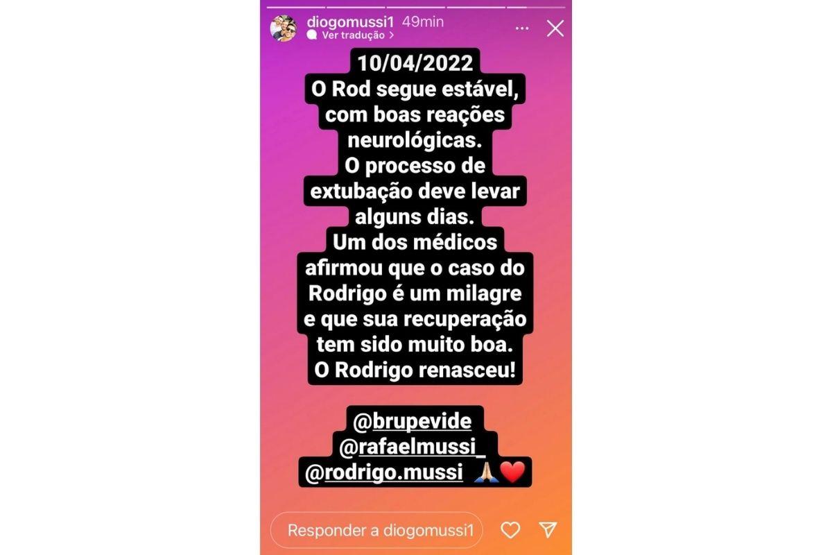 Na noite deste domingo, 10 de abril, Diogo Mussi usou as redes sociais para se pronunciar sobre a extubação de Rodrigo Mussi. O ex participante do BBB 22 sofreu um acidente de carro e, desde então, segue internado em estado estável.