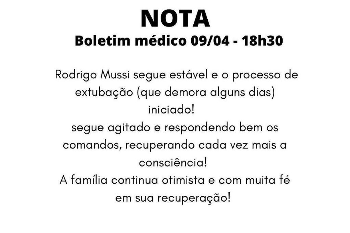 O boletim foi divulgado no Instagram oficial de Rodrigo Mussi, e afirma: “Rodrigo Mussi segue estável e o processo de extubação (que demora alguns dias!) iniciado. Segue agitado e respondendo bem aos comandos, recuperando cada vez mais a consciência! A família continua otimista e com muita fé em sua recuperação”. Desejamos forças aos familiares neste momento delicado.
