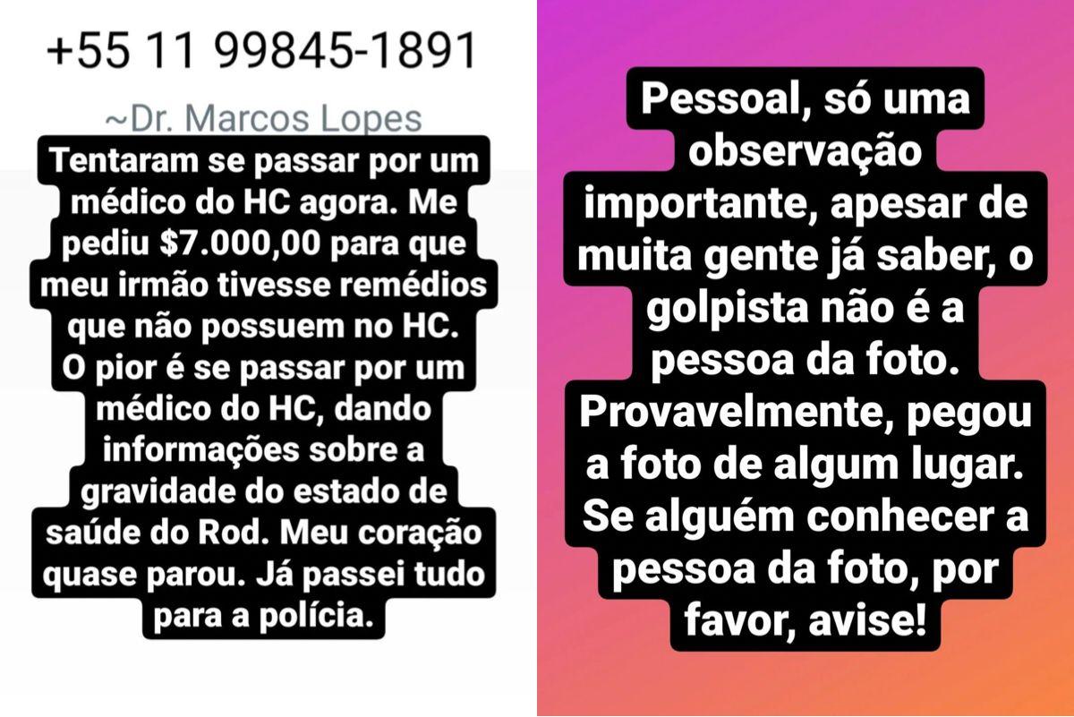 “O pior é se passar por um médico do HC, dando informações sobre a gravidade do estado de saúde do Rod. Meu coração quase parou. Já passei tudo para a polícia” finalizou o homem.