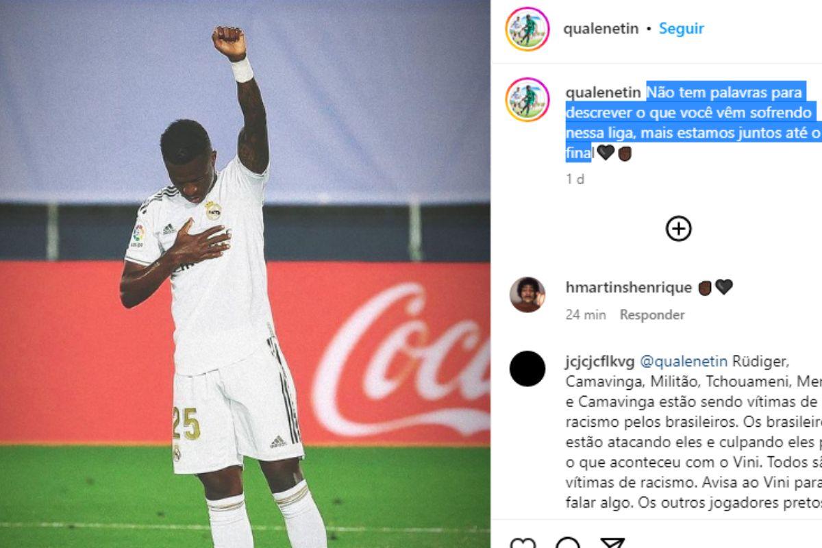 Depois do ataque que Vini Jr recebeu e a resposta da La Liga, que ‘minimizou’ a situação, Netinho [irmão dele] falou sobre a situação. “Não tem palavras para descrever o que você vêm sofrendo nessa liga, mais estamos juntos até o final”, disse ele. A foto publicada é de Vini.