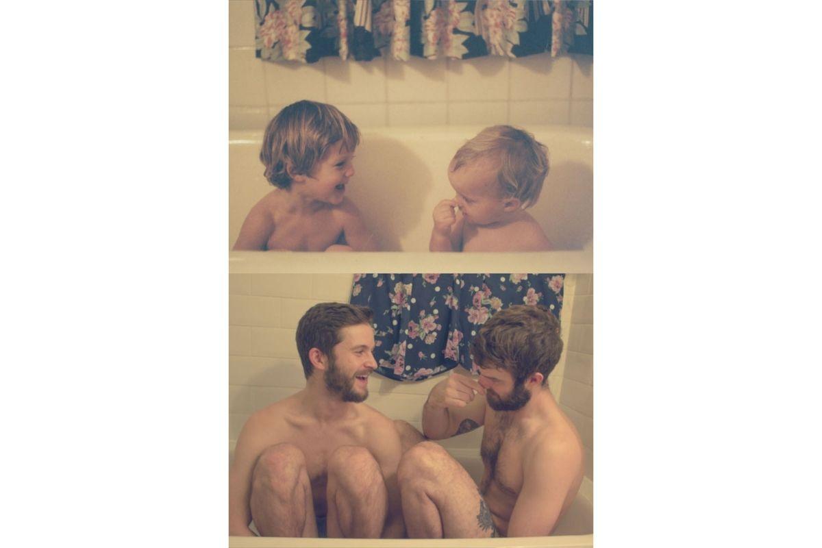 Mais de 2 décadas se passaram entre uma foto e outra e foi perceptível que eles foram mais do que criativos, já que conseguiram recriar com perfeição os cliques. Na banheira, andando de bicicleta ou fazendo brincadeiras típicas de criança, até o figurino foi pensado com cuidado.